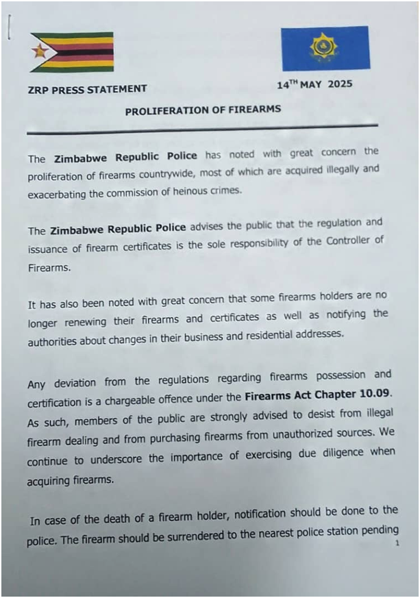 In a press statement, ZRP spokesperson Assistant Commissioner Paul Nyathi said the guns are being acquired illegally and used to commit crimes.