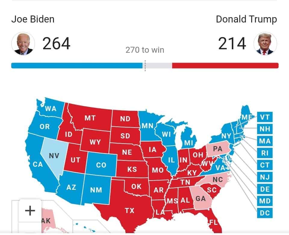 A full day after Election Day, neither candidate had cleared the 270 Electoral College votes needed to win the White House. But Biden’s victories in the Great Lakes states left him at 264, meaning he was one battleground state away from crossing the threshold and becoming president-elect.