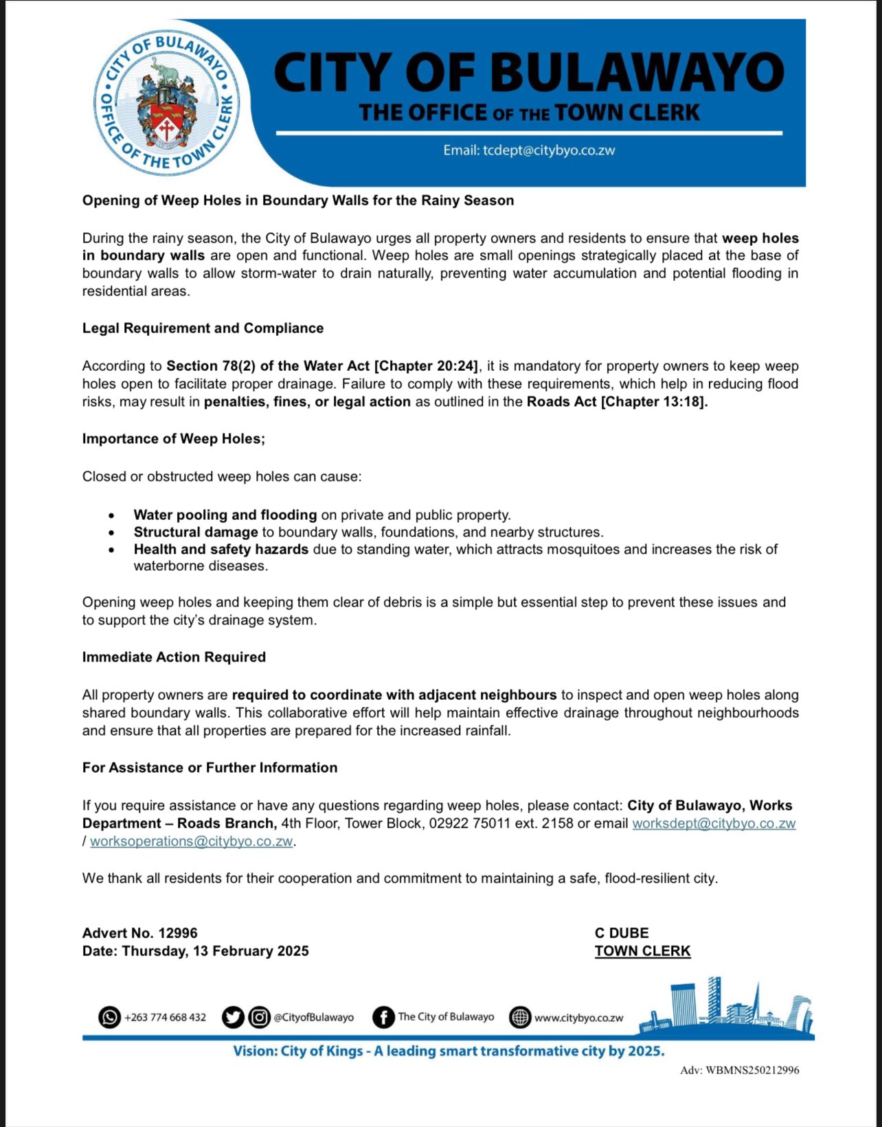 The Bulawayo City Council (BCC) has called on residents to open weep holes on their parameter walls.