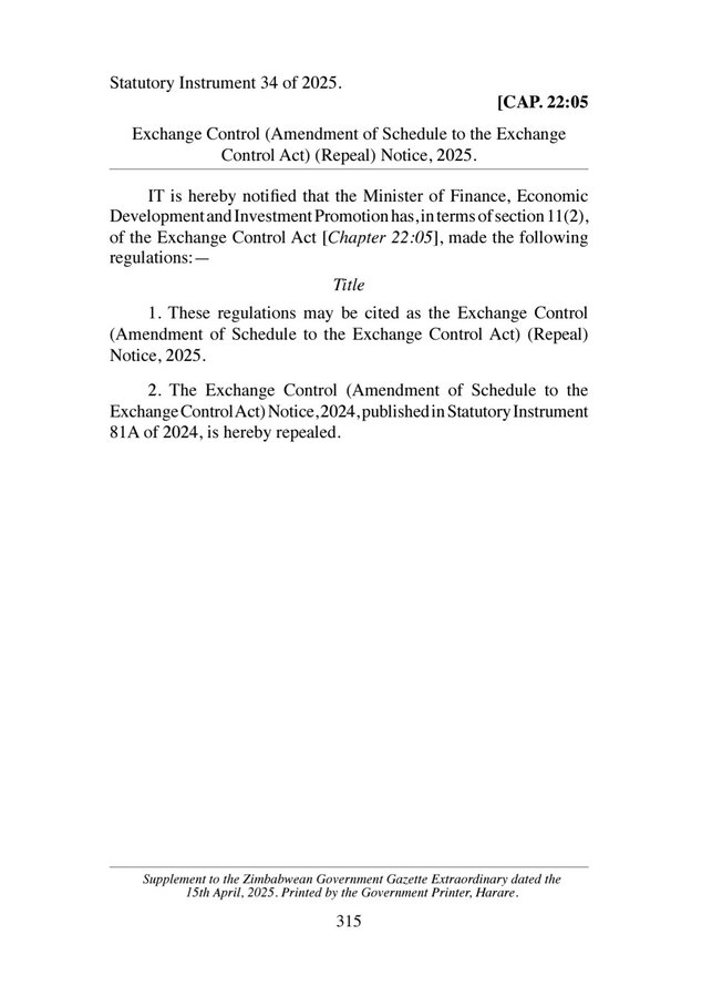 Minister of Finance, Economic Development and Investment Promotion Mthuli Ncube yesterday repealed Statutory Instrument 81A of 2024, which imposed restrictive foreign exchange pricing requirements on formal businesses, compelling them to use the official exchange rate.