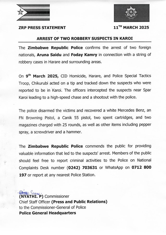 In a press statement ZRP spokesperson Assistant Commissioner Paul Nyathi said the two were linked to a number of robbery cases in and around Harare.
