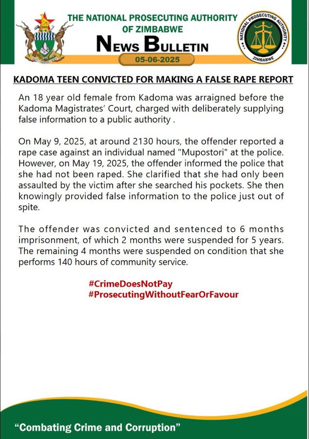 Kadoma teen has been convicted by the Kadoma Magistrates Court for deliberately making a false rape report to police.