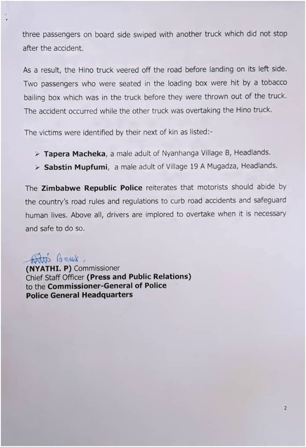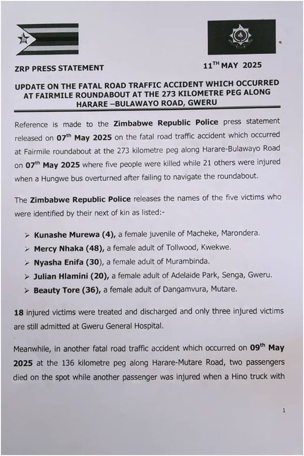 The Zimbabwe Republic Police (ZRP) has announced the names of five individuals who died in a road traffic accident along Harare-Bulawayo road.