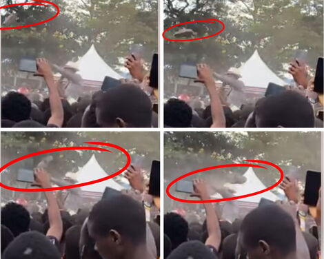 Screenshots showing moments a flying shoe hit President William Ruto; Frame 1: the shoe appears on screen; Frame 2: the shoe flies towards Ruto; Frame 3: the shoe makes contact and Frame 4: Ruto pushes the shoe away.