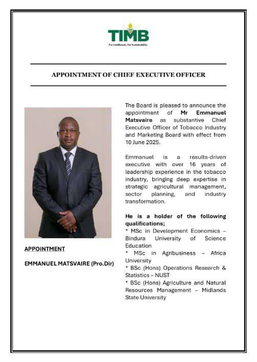 The Tobacco Industry and Marketing Board (TIMB) has appointed Emmanuel Matsvaire as substantive Chief Executive Officer with effect from 10 June 2025.