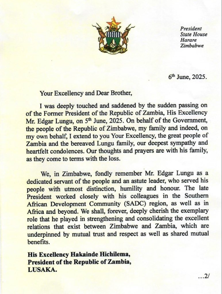 President Emmerson Dambudzo Mnangagwa, has condoled with the Lungu Family, Zambian Government and the Zambian people on the sudden demise yesterday of former President Chagwa Lungu.