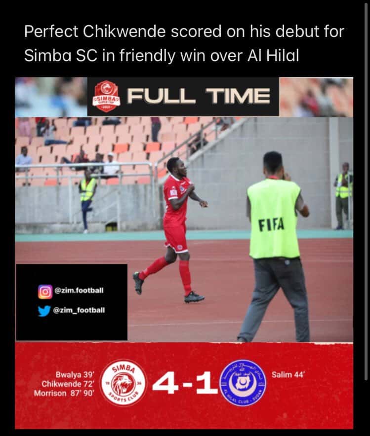 Perfect Chikwende hit the ground running in Tanzania at Simba SC after scoring on his debut as the team won 4-1 against Sudanese giants Al Hilal in the Simba Super Cup at Benjamin Mkapa Stadium on Wednesday afternoon.