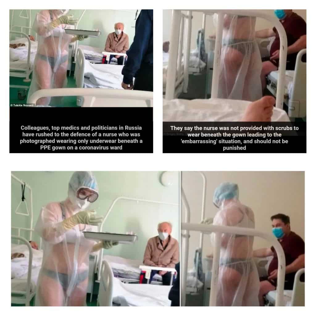 The incident happened at a Tula Region hospital in Russia where the now infamous front-line worker showed up to work in the male ward in a see-through protective suit with nothing but a bikini on underneath.