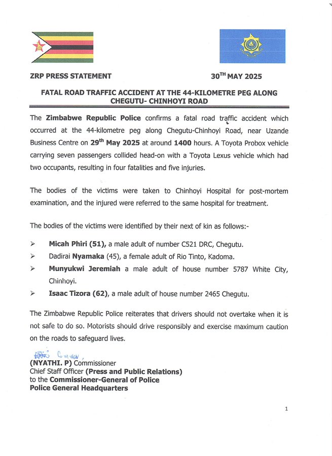 The Zimbabwe Republic Police ZRP has announced the names of the individuals who died in a road traffic accident along Chegutu-Chinhoyi highway.