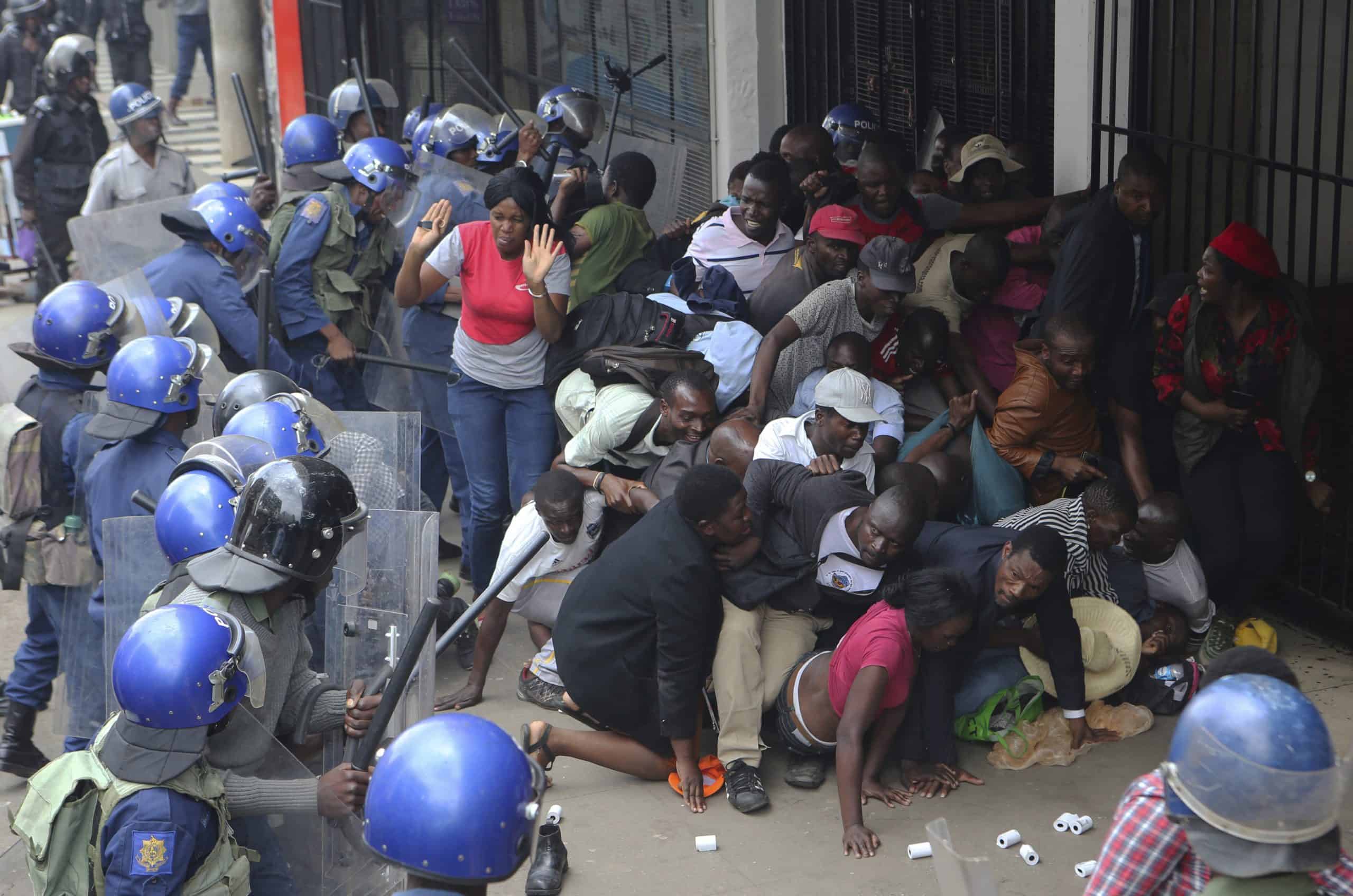 Police surround opposition party supporters who had gathered to hear a speech by the country's top opposition leader in Harare, Wednesday, Nov. 20, 2019. Zimbabwean police with riot gear fired tear gas and struck people who had gathered at the opposition party headquarters to hear a speech by the main opposition leader Nelson Chamisa who still disputes his narrow loss to Zimbabwean President Emmerson Mnangagwa. (AP Photo/Tsvangirayi Mukwazhi)