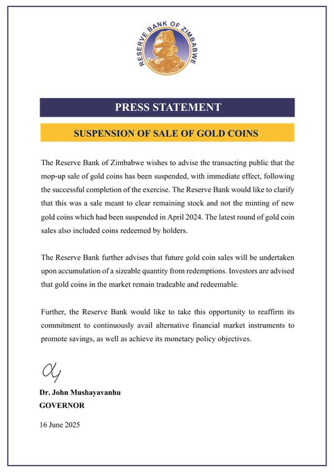 The Reserve Bank of Zimbabwe (RBZ) has suspended mop-up sales of gold coins immediately following the successful clearance of the remaining stock.