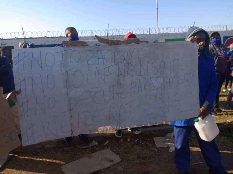The workers held placards which decried unfair labour practices, low-wages, racism and sexual harassment, the Zim Morning Post reported.