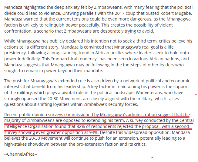 A survey reportedly conducted by the Central Intelligence Organisation (CIO) found that 82% of respondents rejected the proposal to extend President Emmerson Dambudzo Mnangagwa’s term of office.