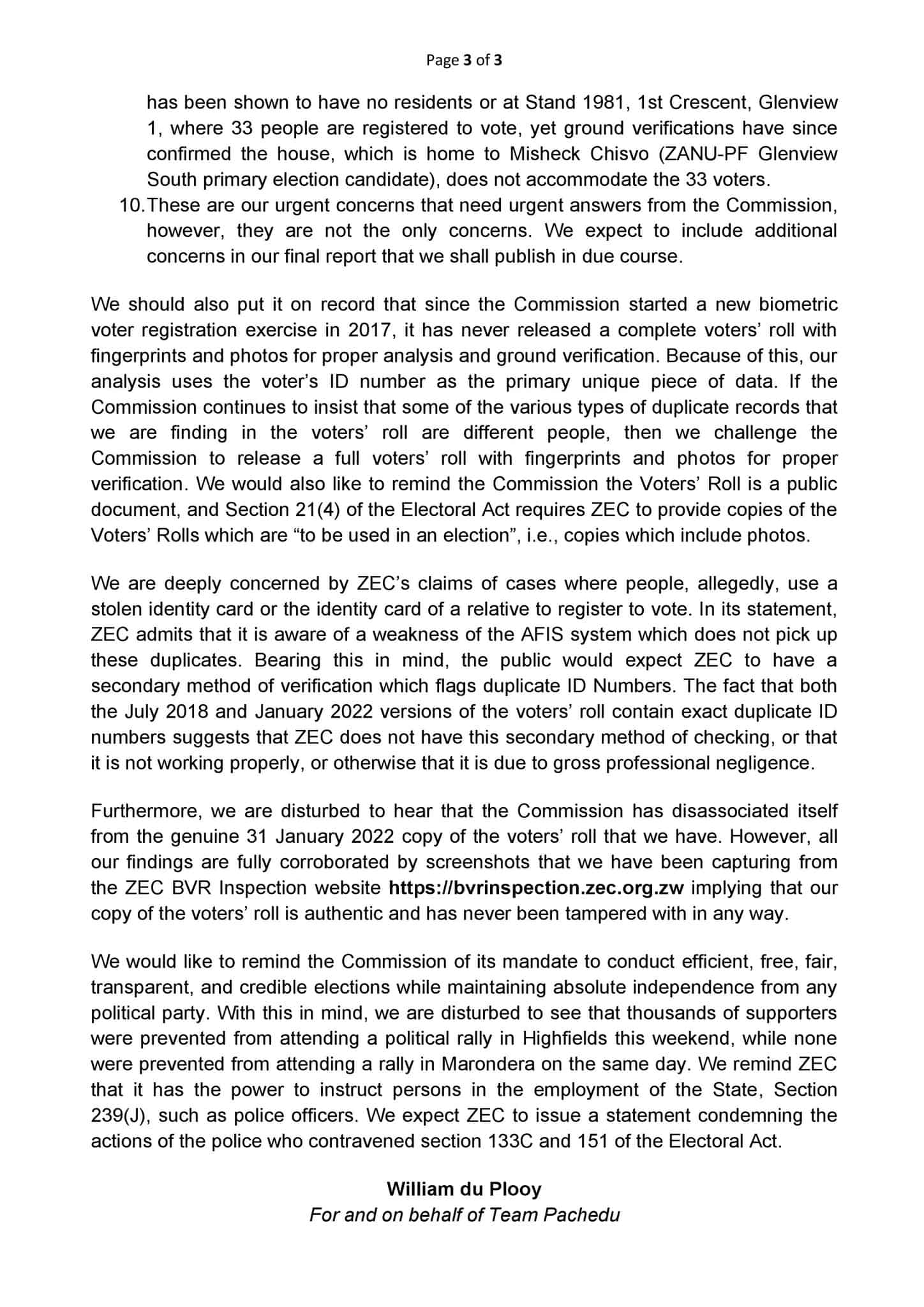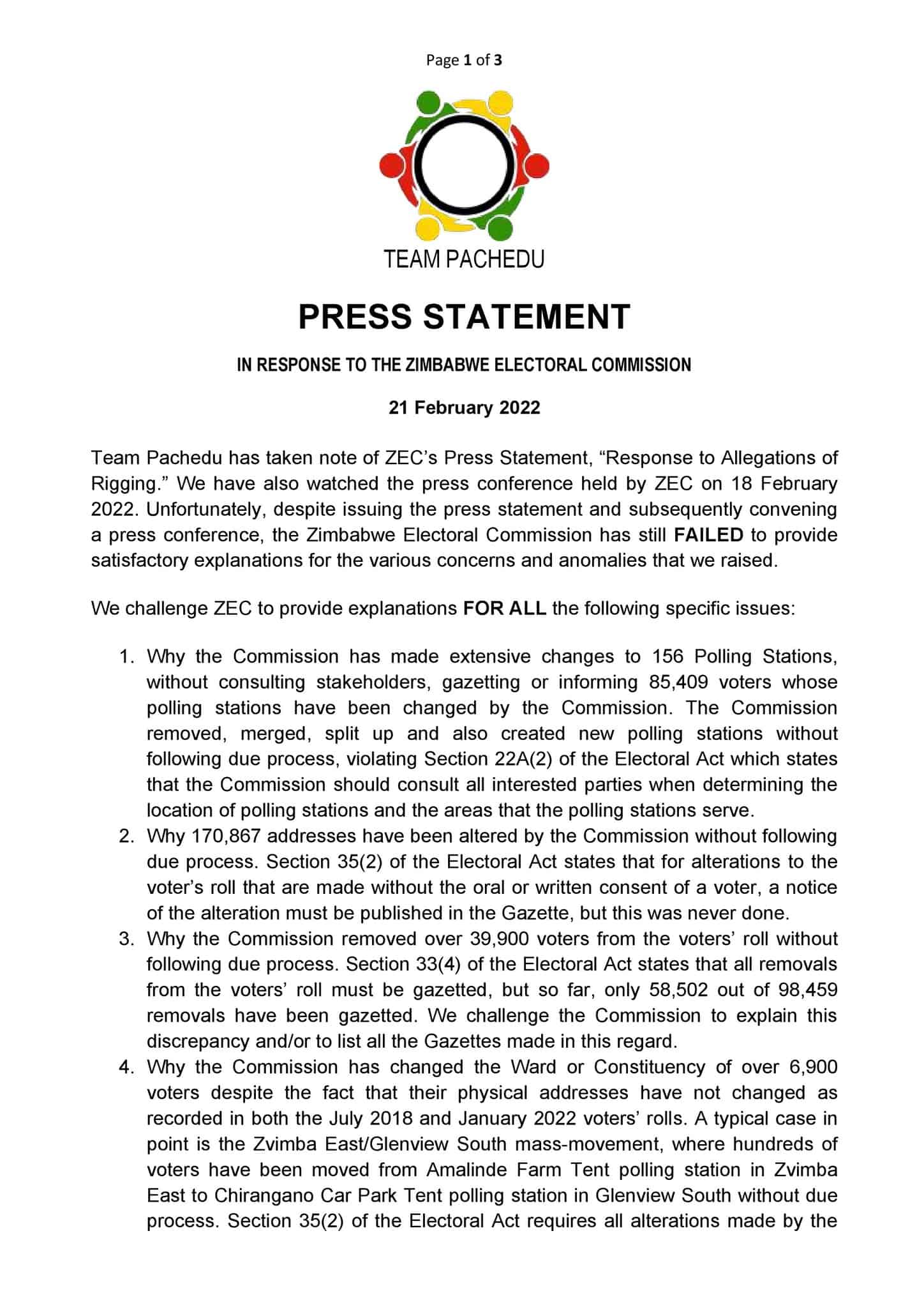 Team Pachedu, a group of patriotic Zimbabwean citizens who strive to promulgate the culture of transparency, responsibility and accountability without any fear or favour has challenged the Zimbabwe Electoral Commission (ZEC) to address raised concerns.