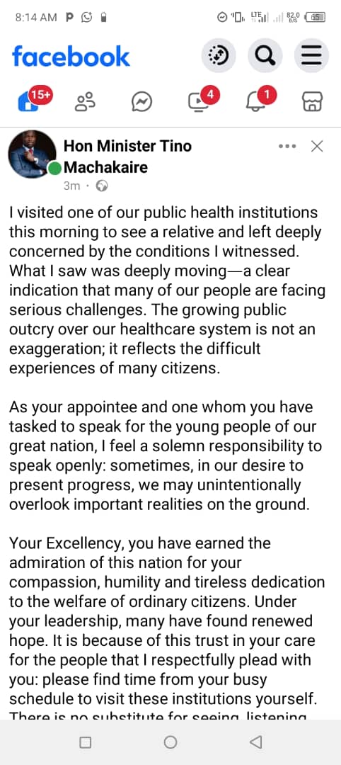 Minister of Youth & ZANU PF National Youth leader Tino Machakaire has requested immediate attention from President Emmerson Dambudzo Mnangagwa and the government over the worrying and deteriorating conditions at Zimbabwe’s public healthcare facilities.