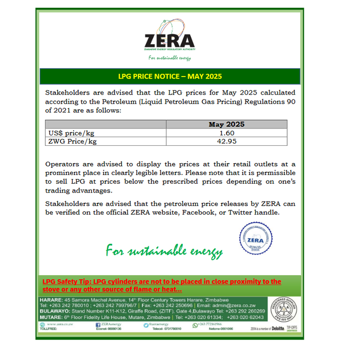 The Zimbabwe Energy Regulatory Authority (ZERA) is a Government entity established by the Energy Regulatory Authority Act Chapter 13:23 of 2011 has announced new fuel and Liquid Petroleum gas prices.