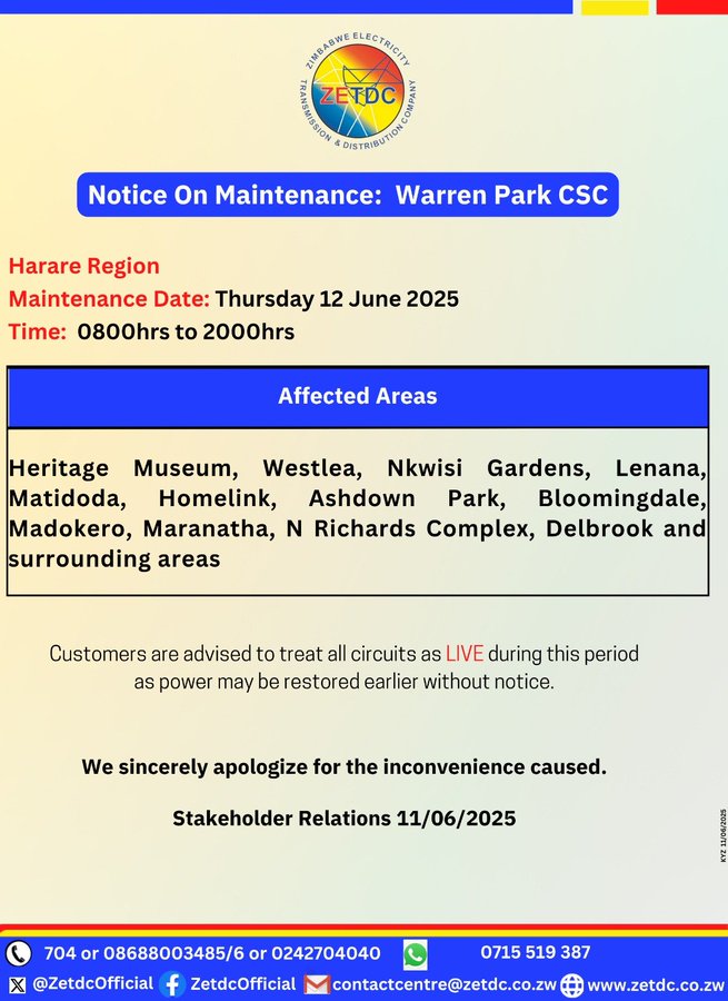 In a public notice, the power utility through its distribution arm the Zimbabwe Electricity Transmission and Distribution Company said the planned outages is to facilitate maintenance works.