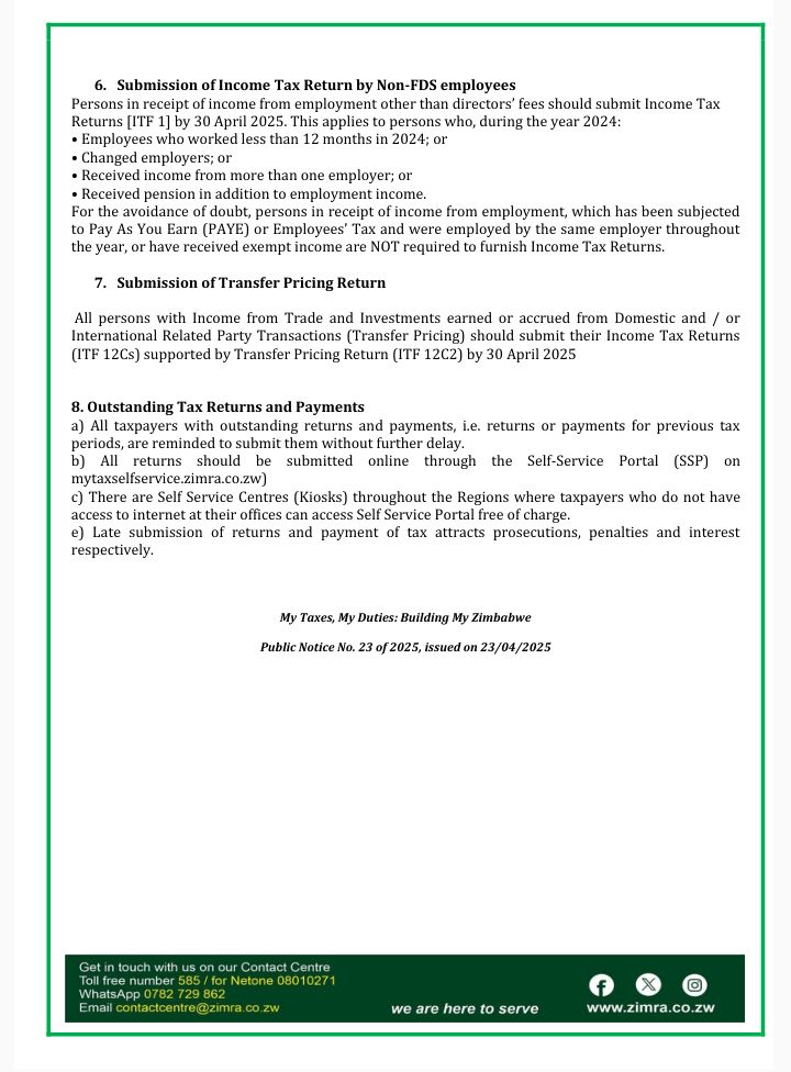 The Zimbabwe Revenue Authority (ZIMRA) says it would want to remind taxpayers that Income Tax Returns for 2024 are due.